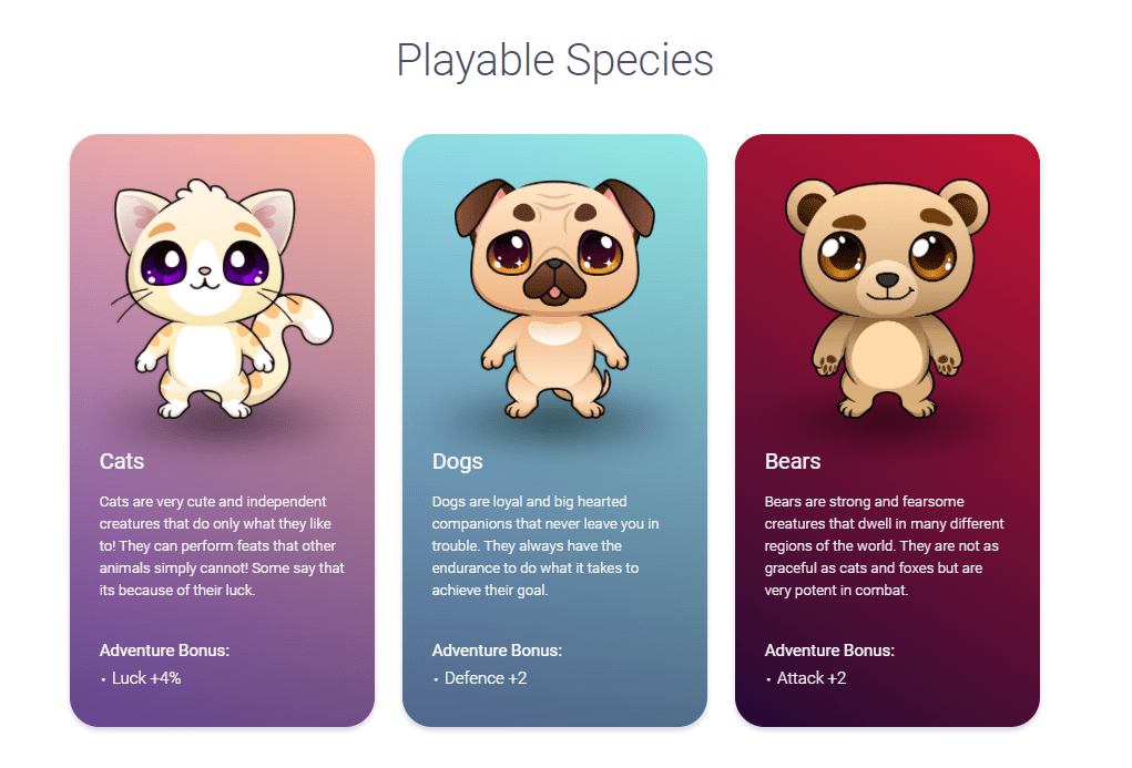 Mọi người đều có sở thích khác nhau và yêu thích những sinh vật khác nhau. Blockchain Cuties Universe thấu hiểu điều đó và đã chuẩn bị cho bạn rất nhiều sinh vật tuyệt vời. Bạn không cần phải chơi trò chơi nhàm chán chỉ dành riêng cho những chú mèo mà sẽ được tận hưởng những sự lựa chọn thú cưng đa dạng nhất từ trước đến nay.