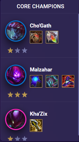 – Lối chơi: Do chỉ tập trung vào đơn vị 3 tiền nên game thủ hãy cố nâng cấp độ 6 – 7 càng sớm càng tốt. Sau đó tập trung vào Cho’gath và Malzahar để ổn định đội hình. Đây là đội hình không quá khó nên rất dễ xây dựng cho các game thủ chưa có nhiều kinh nghiệm.