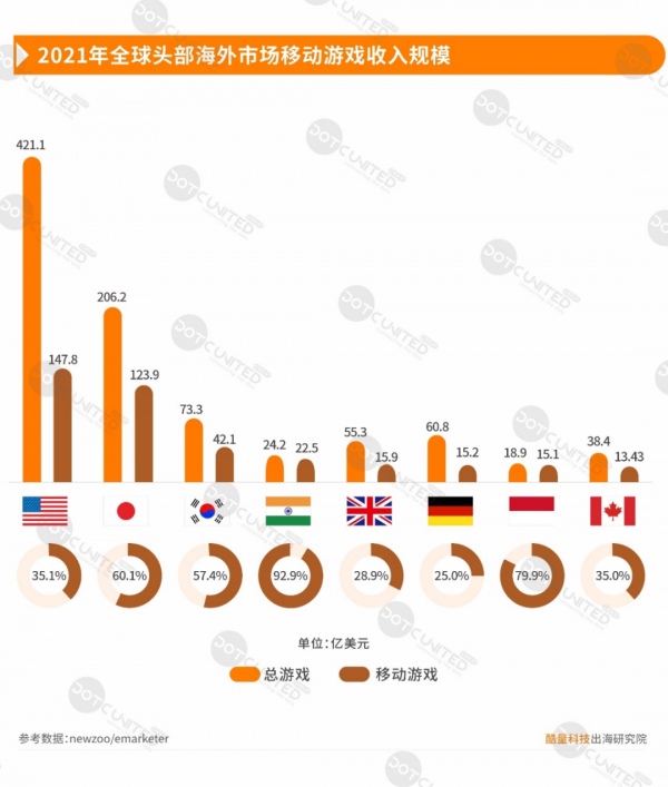 Vào năm 2021, về quy mô thị trường game toàn cầu, từ tổng quy mô game đến lĩnh vực game di động, Trung Quốc vẫn đứng đầu thế giới. Ở thị trường trò chơi di động, Mỹ và Nhật Bản theo sau với lần lượt là 14,78 tỷ USD và 12,39 tỷ USD.