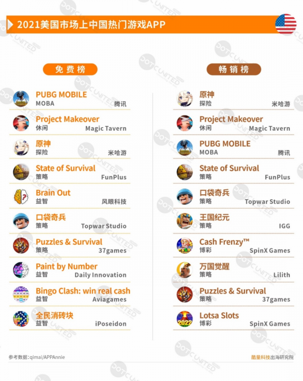 Kết quả danh sách trò chơi trên App Store tại Mỹ từ tháng 01 đến tháng 12 năm 2021 cho thấy trong số tất cả các trò chơi đến từ Trung Quốc, PUBG Mobile của Tencent và Genshin Impact của miHoYo lần lượt đứng đầu trong bảng xếp hạng game miễn phí và danh sách game có doanh thu cao nhất nhất.