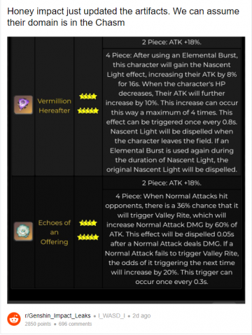 Một rò rỉ Genshin Impact đã tiết lộ thêm chi tiết về hai bộ thánh di vật mới sẽ đến trong bản cập nhật Genshin Impact 2.6 sắp tới. Bộ đầu tiên được gọi là Vermillion Here After, và nó có các hiệu ứng sau: