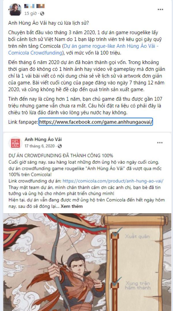 Trên các diễn đàn game uy tín nhất Việt Nam, những bài đăng đáng chú ý liên quan đến vụ việc này cũng đã được đăng tai, trong đó nổi bất nhất là một bài phân tích vô cùng chia tiết và nhận về rất nhiều phản hồi. Bài đăng có nội dung như sau: "Chuyện bắt đầu vào tháng 3 năm 2020, 1 dự án game roguelike lấy bối cảnh lịch sử Việt Nam do 1 bạn lập trình viên trẻ kêu gọi gây quỹ trên nền tảng Comicola (Dự án game rogue-like Anh Hùng Áo Vải - Comicola Crowdfunding), với mức vốn là 100 triệu.