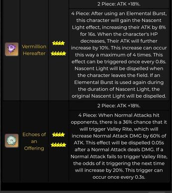 "Vermillion Here After" sẽ phù hợp với các nhân vật DPS, với hai đại diện tiêu biểu có thể kể đến là Xiao và Razor. Trong khi đó, "Echoes of an Offering" sẽ hữu ích hơn với nhân vật sử dụng Nguyên tố Thủy được công bố gần đây là Kamisato Ayato.