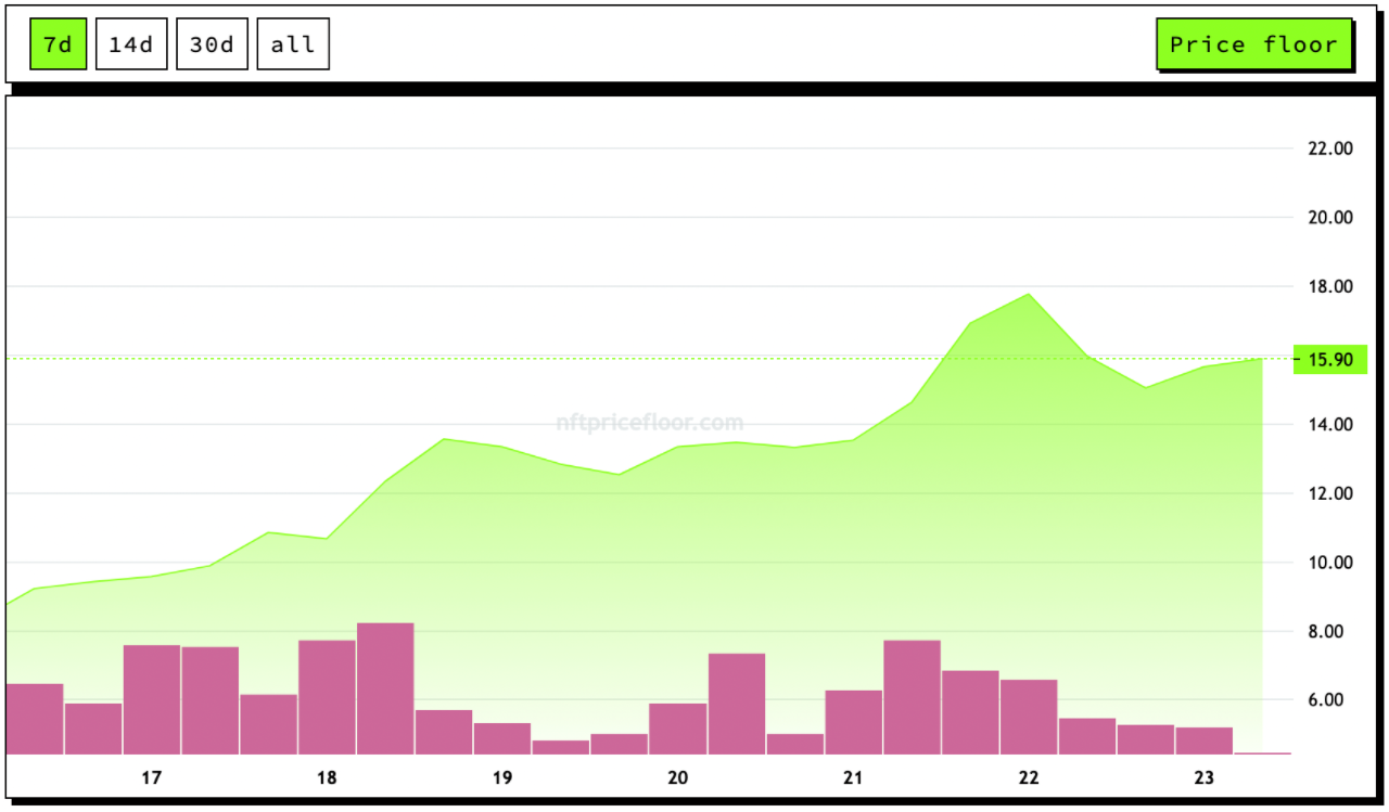 NFT Worlds đã chứng kiến sự gia tăng tăng trưởng trong bảy ngày qua, đạt mức giá sàn gần 18 Ether.