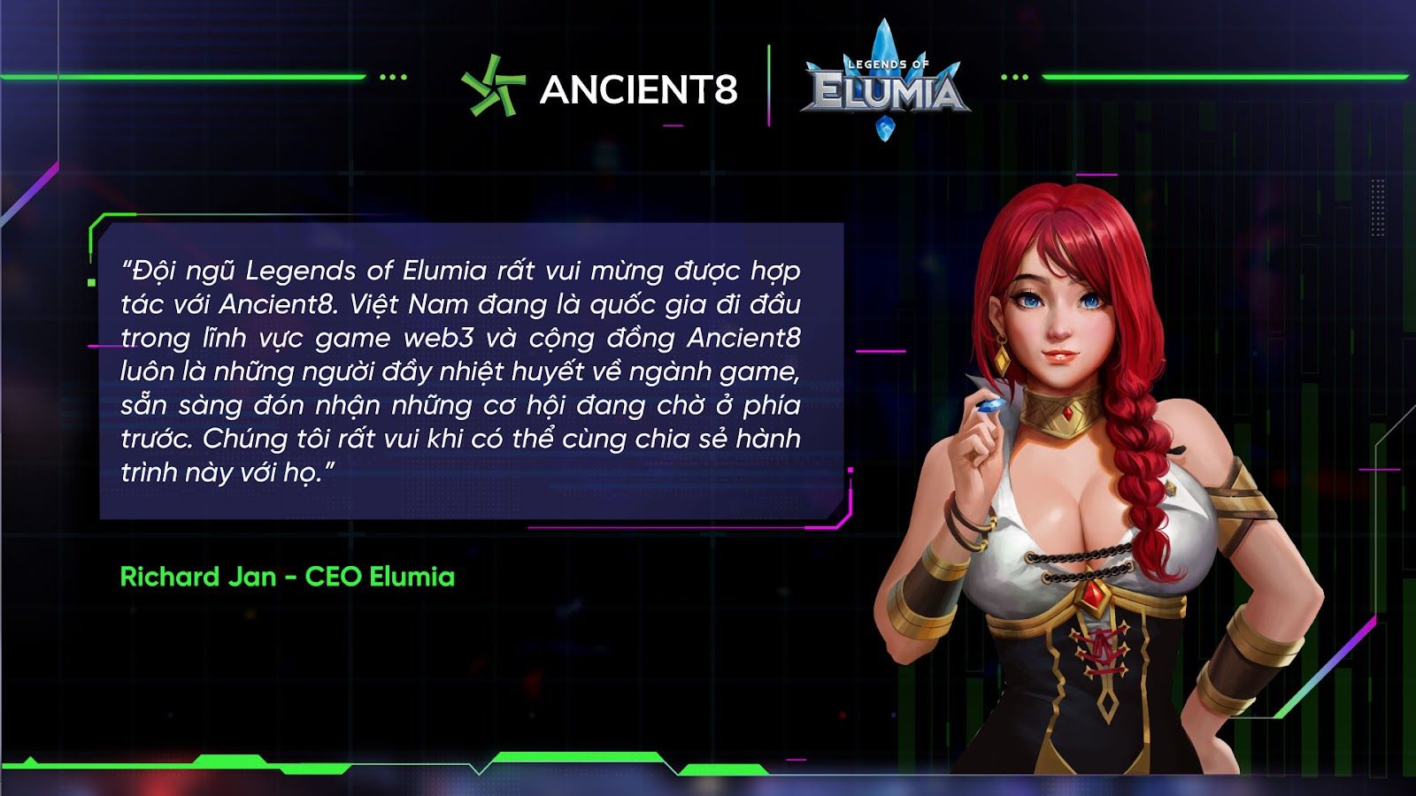 Ancient8 rất vui khi được đồng hành cùng các “Elumians” có cùng chí hướng để thúc đẩy việc áp dụng công nghệ Web3 trên toàn cầu. Mọi người đều thích chơi game, metaverse và giải trí, đây cũng là giá trị mà Elumia nhắm đến để thu hút cộng đồng.