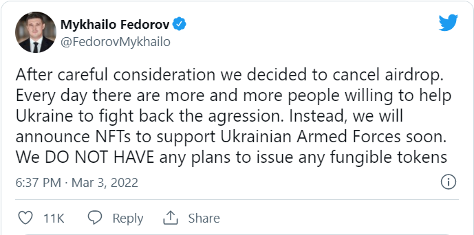 Tuy nhiên, hôm nay Phó thủ tướng đã thông báo đợt airdrop bị hủy bỏ nhưng vẫn tiếp tục xem xét các cách để mọi người huy động tiền cho Ukraine thông qua blockchain.