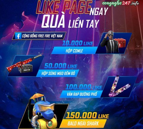 Để tham gia sự kiện like, share trang fanpage rất dễ dàng, bạn chỉ cần một tài khoản game của game đó là có thể tham gia được. Vì sự kiện này tham gia dễ dàng nên thường vật phẩm, tài nguyên nhận được không có quá nhiều nổi bật. Thông thường là một số tài nguyên hoặc nhân vật phổ biến.