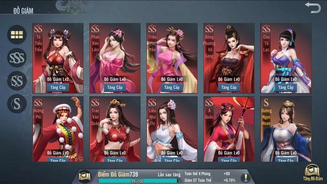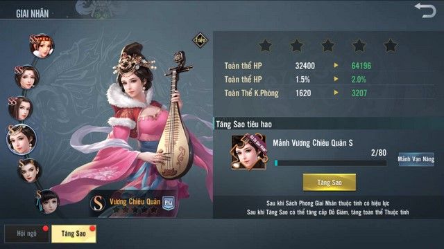 Mong manh là vậy nhưng các mỹ nhân đó lại có sức mạnh tham chiến cực kỳ đáng gờm. Nhất là với nữ nhân mang bậc SS. Đối với các tướng có chỉ số bậc thấp hơn, bạn hoàn toàn có thể nâng cấp họ thông qua tính năng Tăng sao Giai Nhân. Phải chịu tiêu hao một số lượng mảnh nhất định song bù lại, bạn sẽ có một mỹ nhân tài sắc vẹn toàn.
