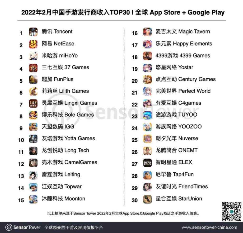 Thời gian báo cáo và thống kê cho tháng 02 năm 2022. Trong số này, có tổng cộng 36 hãng phát hành Trung Quốc lọt vào danh sách Top 100 nhà phát hành game di động toàn cầu, với tổng doanh thu gần 2 tỷ đô la Mỹ, chiếm gần 37,9% doanh thu trong Top 100.