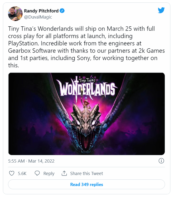 Tuy nhiên, khi Giám đốc điều hành kiêm chủ tịch của Gearbox, Randy Pitchford chia sẻ về tính năng hỗ trợ crossplay của Tiny Tina’s Wonderlands, ông cho biết tính năng crossplay của PlayStation sẽ được kích hoạt và đặc biệt đặt tên là Sony mang ý nghĩa là “cùng làm việc về vấn đề này”. Nhiều người chơi co-op là một tính năng chính của game, vì vậy việc Sony hỗ trợ các nền tảng đồng nghĩa sẽ có nhiều người có thể chơi cùng nhau hơn.
