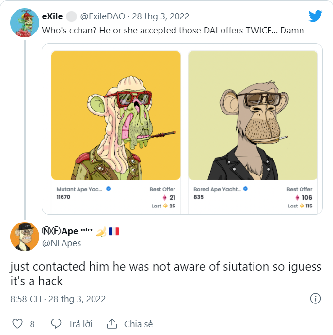 Tuy nhiên, một số lại cho rằng người kia đã bị hack hoặc là đối tượng bị nhắm đến bởi một âm mưu tấn công. Lý do là bởi người mua bị phát hiện đang đặt rất nhiều lệnh mua NFT BAYC cũng với giá chỉ vài trăm DAI, chờ đợi con mồi tiếp theo “sập bẫy” vì sự sơ suất của mình.