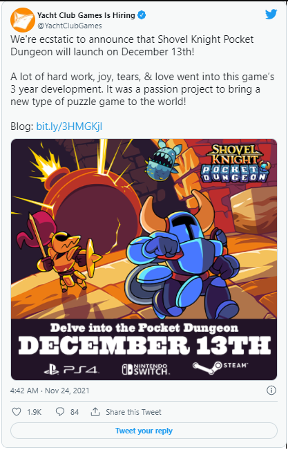 Trong một bài đăng trên blog gần đây, Yacht Club Games đã đưa ra thông báo rằng Shovel Knight Pocket Dungeon cuối cùng sẽ phát hành vào ngày 13 tháng 12 năm 2021. Gần hai năm sau đưa ra thông báo của về tựa game roguelike giải đố, người chơi sẽ sớm có thể trải nghiệm cuộc phiêu lưu dưới lòng đất mới nhất của Shovel Knight. Studio indie cũng đã công bố ba phần nội dung có thể tải xuống được lên kế hoạch để mở rộng tựa game sắp tới trong năm sau.
