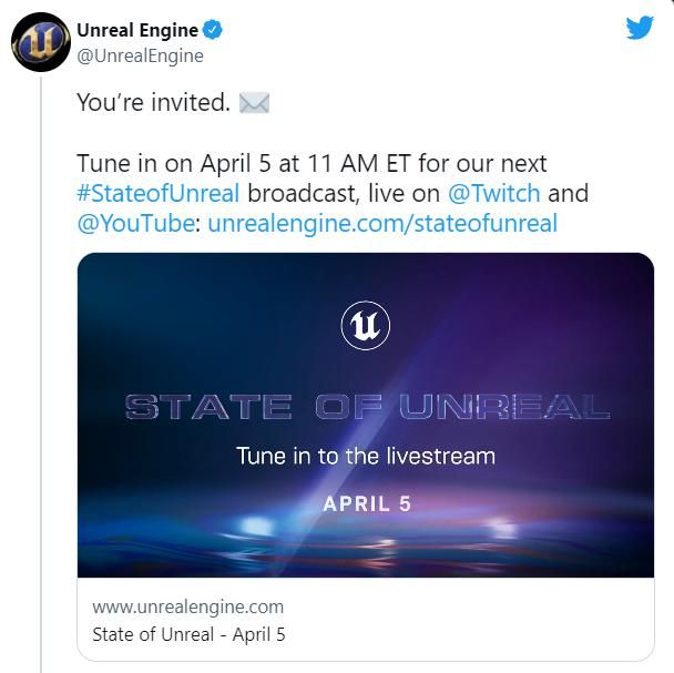 Dự kiến phát sóng vào ngày 5 tháng 4, chương trình phát sóng được gọi là State of Unreal của Epic Games sẽ có những diễn giả bao gồm Tim Sweeney, cũng như một số nhà phát triển chịu trách nhiệm về tựa game The Matrix Awakens, là một trong những tựa game có bản demo ấn tượng nhất từng được phát hành. Mặc dù không rõ chúng ta sẽ được thấy những tựa game nào khác ngoài The Matrix trong sự kiện hay không, nhưng điểm chung của các tựa game sẽ xuất hiện chắc chắn sẽ là Unreal Engine 5.