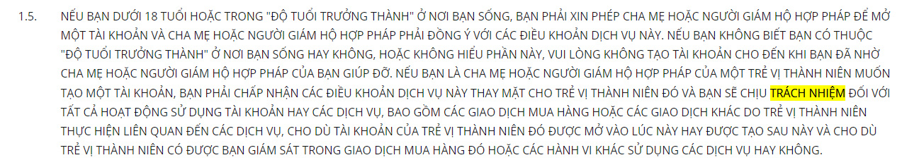 Nếu bạn là cha mẹ hoặc người giám hộ hợp pháp của một trẻ vị thành niên muốn tạo một tài khoản, bạn phải chấp nhận các điều khoản dịch vụ này thay mặt cho trẻ vị thành niên đó và bạn sẽ chịu trách nhiệm đối với tất cả hoạt động sử dụng tài khoản hay các dịch vụ, bao gồm các giao dịch mua hàng hoặc các giao dịch khác do trẻ vị thành niên thực hiện liên quan đến các dịch vụ, cho dù tài khoản của trẻ vị thành niên đó được mở vào lúc này hay được tạo sau này và cho dù trẻ vị thành niên có được bạn giám sát trong giao dịch mua hàng đó hoặc các hành vi khác sử dụng các dịch vụ hay không.”