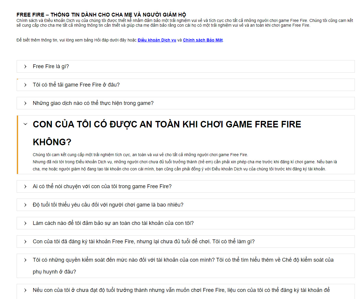 Hãy đọc kỹ điều khoản này để thấy rằng NPH khôn ngoan như thế nào để “đẩy” trách nhiệm quản lý người chơi nhỏ tuổi về cho phụ huynh, bất chấp việc họ có biết là con mình có đang chơi Free Fire hay không. Bên cạnh đó thì nếu ai không đọc điều khoản dịch vụ thì cũng nên “ngó” qua một chút những lời giải đáp của bộ câu hỏi dành cho thắc mắc từ phụ huynh.