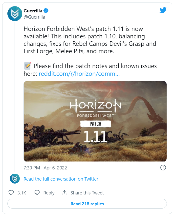 Ngay sau đó, 2 bản vá mới đã được cập nhật vào hôm qua, kết hợp các bản vá 1.10 và 1.11 thành một bản cập nhật duy nhất cho Horizon Forbidden West. Các bản vá mới nhất chứa 57 bản sửa lỗi và cải tiến khác nhau, giải quyết các vấn đề về lối chơi, đồ họa, hiệu suất, giao diện người dùng và tiến trình nhiệm vụ.