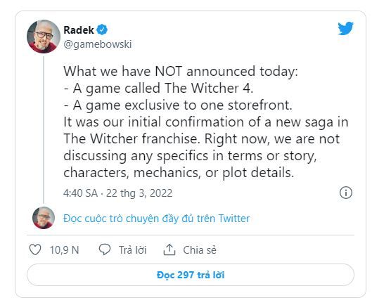 “Những gì chúng tôi KHÔNG công bố ngày hôm nay: Một trò chơi có tên The Witcher 4. Một trò chơi độc quyền cho một cửa hàng,” ông Grabowski viết. “Đó là những thông tin ban đầu của chúng tôi về chương mới trong series The Witcher. Hiện tại, chúng tôi không thảo luận bất kỳ chi tiết cụ thể nào về nội dung, nhân vật, cơ chế hoặc cốt truyện.”