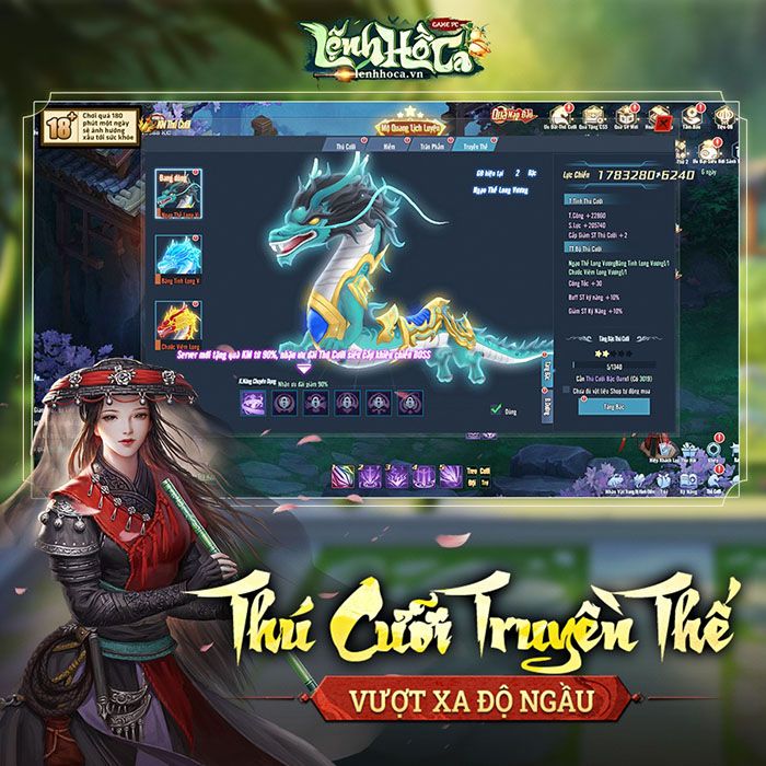Bên cạnh hệ thống đồng hành, thì hệ thống Thú Cưỡi của game Lệnh Hồ Ca cũng cực kỳ đa dạng, từ các thú cưỡi cơ bản, đến các thú cưỡi hiếm, trân phẩm và cao nhất chính là Truyền Thế. Mỗi thú cưỡi có các chỉ số khác nhau, kỹ năng khác nhau góp phần tạo nên những lối build đa dạng cho từng nhân vật