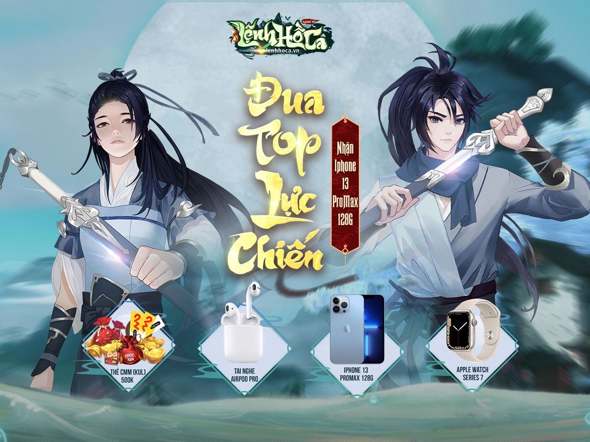 Để chào mừng game ra mắt, Lệnh Hồ Ca công sự kiện siêu hot đua top lực chiến nhận Iphone 13 Promax 128GB cùng các phần quà hấp dẫn khác như Apple Watch Series 7 bản thường, tai nghe Airpod Pro, thẻ CMN (Kul) giá 500k và hàng trăm ngàn phần quà ingame, tổng giải thưởng lên tới gần 100 triệu đồng.