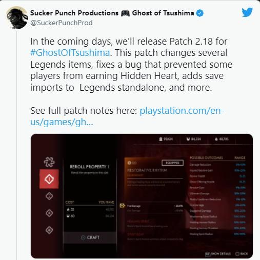 Tuần trước, Sucker Punch đã phát hành bản cập nhật 2.18 cho Ghost of Tsushima, bản cập nhật này chủ yếu giải quyết các lỗi nhỏ và thay đổi cân bằng cho chế độ nhiều người chơi Legends. Tuy nhiên điều đáng chú ý và cũng quan trọng nhất chính là một ghi chú nhỏ từ nhóm phát triển ở cuối thông tin bản cập nhật. Thông báo xác nhận rằng Sucker Punch sẽ không còn "làm việc với bất kỳ bản cập nhật bổ sung nào tại thời điểm này nữa.” Nói cách khác, sự hỗ trợ dành cho Ghost of Tsushima đã chấm dứt.