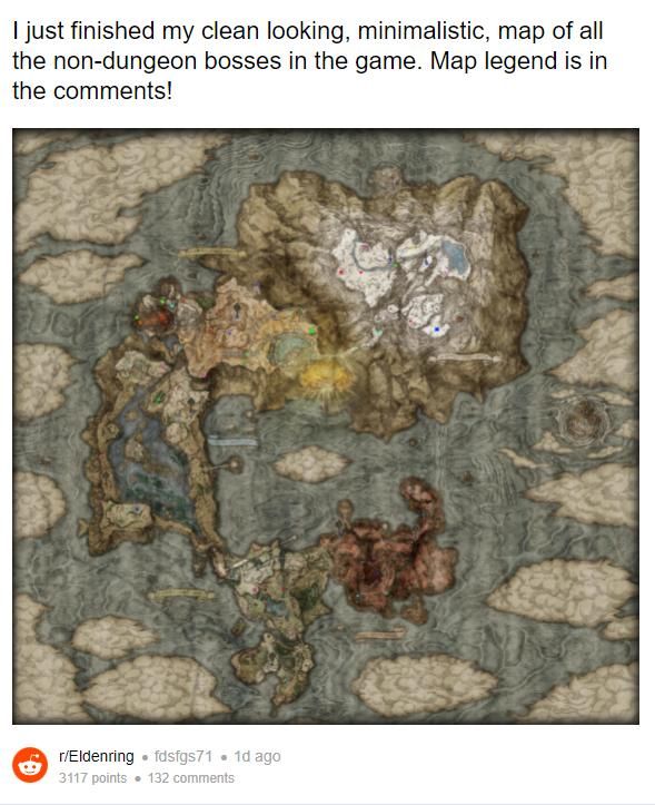 Người dùng Reddit fdsfgs71 gần đây đã cung cấp thêm một chút hướng dẫn cho những người đi khắp Trung Địa bằng cách tạo và chia sẻ bản đồ đánh dấu vị trí của mọi con trùm trong game. Mỗi điểm đánh dấu con trùm là một hình dạng cụ thể hoặc được mã hóa bằng màu sắc để cho người chơi biết một số thông tin cụ thể trước khi quyết định có nên chạm trán hay không, chẳng hạn như con trùm chỉ xuất hiện vào ban đêm hay các cuộc chiến diễn ra trong Evergaol. Chú thích đầy đủ của chúng có thể được tìm thấy trong phần bình luận của bài đăng.