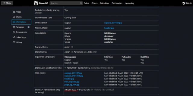 Cụ thể thì theo báo cáo của Gamereactor, trang SteamDB của Poppy Playtime vừa qua đã dán nhãn phát hành cho Chapter 2 là ngày 29/4. Mặc dù mục “Release Date” chỉ đơn giản để là “Coming Soon” nhưng mục “Store API Release Date” lại đề cập đến một ngày cụ thể là 29/4.