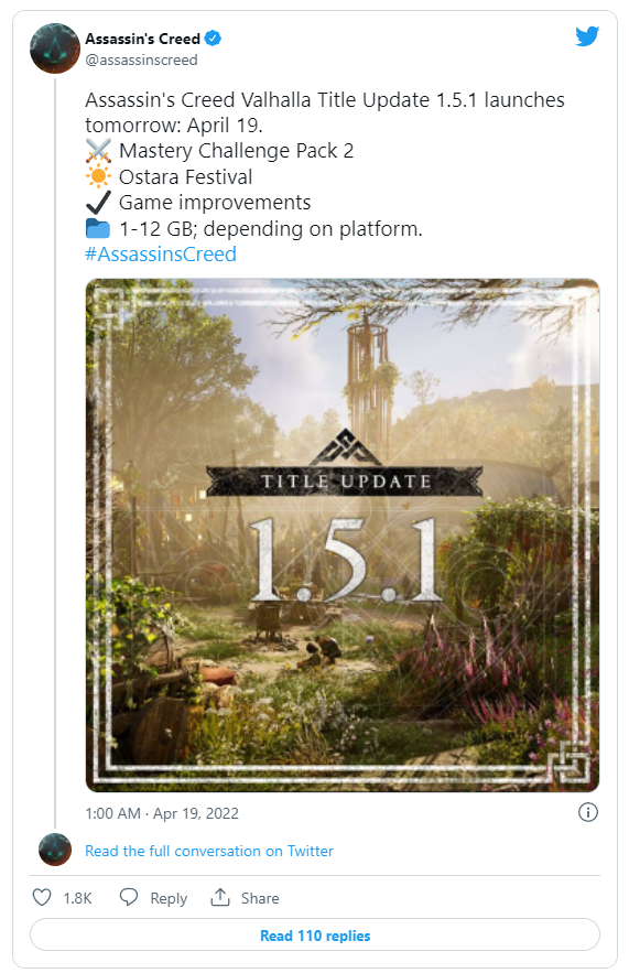 Bản cập nhật 1.5.1 được thêm vào Assassin's Creed Valhalla, hứa hẹn sẽ mang lại nhiều thứ cho game nhập vai có dịch vụ trực tuyến này. Ngoài một số cải tiến giúp tối ưu hóa trải nghiệm Assassin's Creed Valhalla, bản cập nhật còn bao gồm Mastery Challenge Pack 2, Lễ hội Ostara hàng năm, v.v. Bản cập nhật miễn phí lần này cho thấy nỗ lực của Ubisoft nhằm giúp Assassin's Creed Valhalla tạm lấp đầy sự mong chờ của người hâm mộ trong thời gian chờ đợi Assassin's Creed Infinity phát hành cũng như lời đồn Assassin's Creed Rift ra mắt.