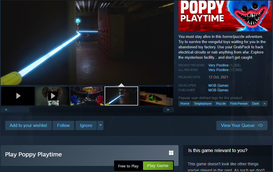 Poppy Playtime hiện được tải xuống và chơi miễn phí trên Steam, với mức giá trước đây là 69.000 VND dường như đã được nhà phát triển thay đổi.