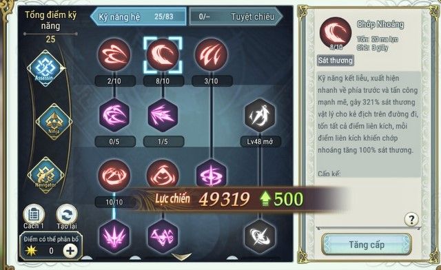 Cũng từ đây, bạn sẽ biết nên tăng kỹ năng nào trước, chiêu thức nào sau, để tối đa sát thương, sức mạnh mà vẫn đảm bảo được mức lực chiến cần thiết. Bạn có thể nhận được điểm kỹ năng khi lên level, hoặc đổi bằng 2 loại tài nguyên chính là: Exp và Bạc.