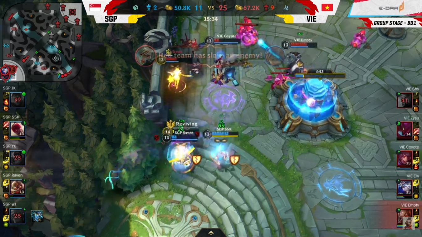 Ở trận đấu gặp gỡ đội tuyển Singapore, đại diện Việt Nam để đem ra con bài Ashe nổi tiếng với khả năng “bách phát bách trúng” Đại Băng Tiễn của mình. Và không nằm ngoài dự đoán, chủ nhà Việt Nam tiếp tục thi đấu áp đảo và giành chiến thắng đầy ấn tượng sau 15 phút thi đấu.