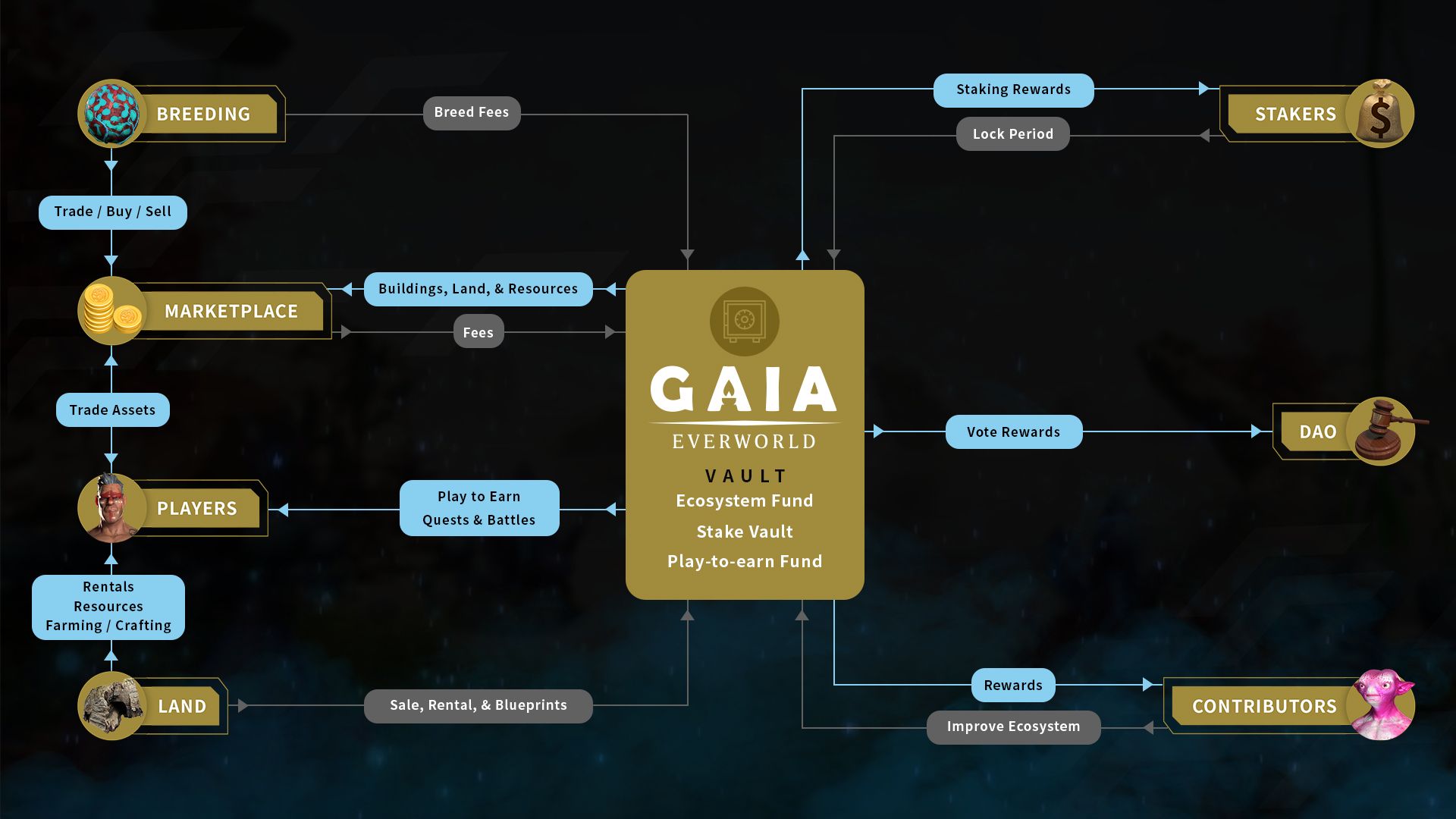 Gaia EverWorld là một thế giới giả tưởng với các vương quốc và sinh vật thần thoại. Các sinh vật được gọi là Gaia,và chúng được tạo ra chuẩn bị cho chiến tranh. Hai chế độ chơi đầu tiên được phát hành sẽ là chế độ Chiến đấu, một trò chơi chiến đấu trên đấu trường theo lượt PvP và sau đó là một trò chơi chiến lược thời gian thực được gọi là chế độ Quân đoàn. Ngoài ra, trò chơi phiêu lưu MMORPG đầy đủ sẽ có thể chơi được trong metaverse Gaia Everworld. Tại đây, người chơi sẽ có thể xây dựng trên mảnh đất của mình và tạo ra các cơ hội kiếm tiền cho bản thân và chỉ bị giới hạn bởi khả năng sáng tạo của chính người chơi mà thôi.