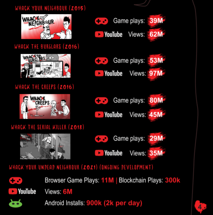 Tiếp nối thành công của Whack It, nhà sáng tạo game đã kết hợp sức mạnh blockchain với kinh nghiệm sáng tạo của mình và cho ra đời nhiều tựa game hấp dẫn hơn nữa. Khi thị trường NFT game dường như đang bão hòa thì Fear NFT thật sự là một lựa chọn hấp dẫn với chủ đề và phong cách mới mẻ. Các tựa game được nhà sản xuất cho ra mắt kết hợp nhuần nhuyễn giữa yếu tố kinh dị, đẫm máu, hồi hộp và pha chút hài hước. Người chơi có thể trải qua những giờ phút thư giãn tuyệt vời trong lúc tạo ra lợi nhuận thật sự cho mình.