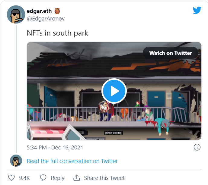 Tầm nhìn của South Park về một thế giới khoảng 40 năm kể từ bây giờ ngụ ý rằng sự điên cuồng xung quanh sự sụt giảm NFT khó có thể lắng xuống đối với nhiều nhà đầu tư. Tuần này, Wikipedia lần đầu tiên tham gia vào lĩnh vực này, bán phiên bản mã hóa của thông báo đầu tiên được đăng lên trang web của mình vào năm 2001 với giá 750.000 đô la. Tuy nhiên, một số NFT đã được bán đấu giá hàng triệu đô la và được giao dịch để lấy các vật phẩm có giá trị trong thế giới thực , bao gồm cả ô tô.