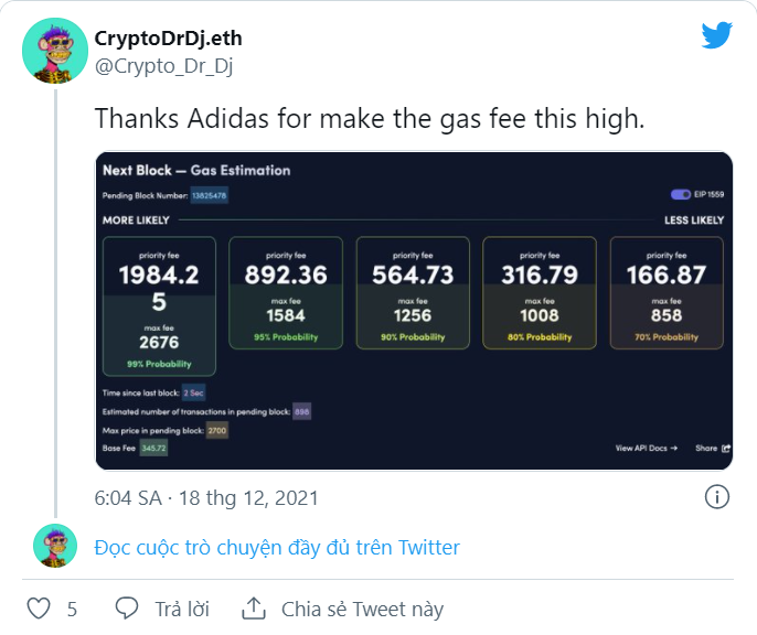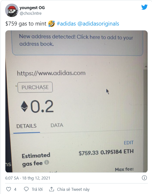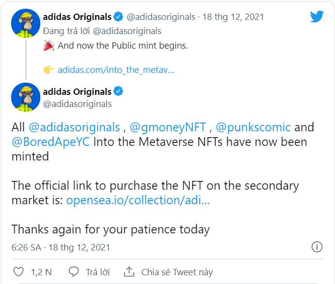 adidas Originals đã thu về khoảng 5.924 ETH cho đợt mở bán NFT được tổ chức vào sáng ngày 18/12.
