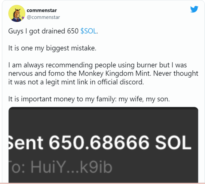 "Các bạn, tôi đã rút hết 650 đô la SOL. Đó là một sai lầm lớn nhất của tôi. Tôi luôn khuyến nghị mọi người sử dụng ổ ghi. Dù lo lắng nhưng tôi vẫn tìm đến Monkey Kingdom Mint. Không thể tin được đó là một liên kết bất hợp pháp."