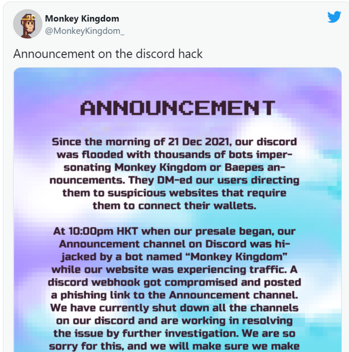 (@MonkeyKingdom_) ngày 21 tháng 12 năm 2021 Thật bi thảm, vụ hack diễn ra khi người dùng đang xếp hàng chờ đợt giảm thứ hai của dự án. MonkeyKingdom bao gồm 2.222 NFT được tạo ra bằng thuật toán xoay quanh "Vua Khỉ" trong văn học dân gian Trung Quốc. Tất cả số tiền thu được từ việc bán NFT ban đầu được dùng cho một tổ chức từ thiện. Chúng tôi muốn hỗ trợ các cộng đồng châu Á trên toàn thế giới. Đây là một trong những dự án NFT thành công nhất bắt nguồn từ Châu Á.