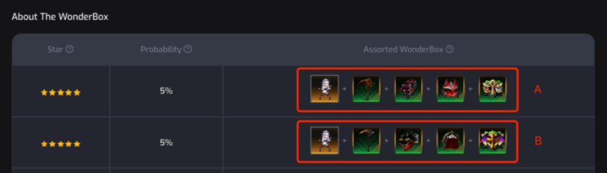 Mỗi WonderBox chứa 5 NFT. Sau khi mở hộp, người dùng sẽ nhận được 1 da anh hùng, 1 vũ khí và 3 trang bị. Mỗi WonderBox đều được chọn ngẫu nhiên, từ 2 sao đến 5 sao, trong đó 5 sao là xếp hạng cao nhất.