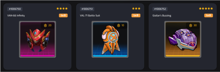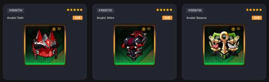 Dựa trên biểu đồ này, chúng ta có thể thấy có 2 màu nền khác nhau cho NFT 3 sao, 4 sao và 5 sao. Nền xanh lam, tím và cam đại diện cho một trang bị độc lập, chúng không kích hoạt khả năng của bộ trang bị, trong khi nền xanh lục thể hiện NFT là một phần của bộ trang bị.