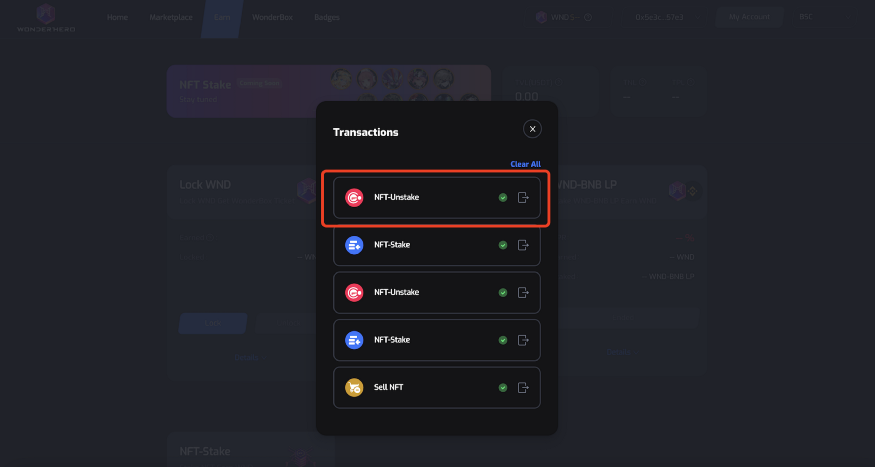 Bước 4: Sau khi yêu cầu staking được gửi đi, người dùng có thể đóng cửa sổ bật lên và chuyển đến ví của mình để xem trạng thái staking trong [Transaction] – [NFT-Stake].