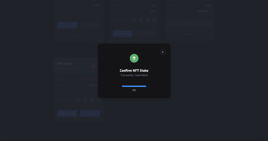 Bước 5: Sau khi staking thành công, trong mục [NFT-Stake] trên trang chính, người dùng sẽ thấy NFT đã staking và WND kiếm được trong thời gian staking.