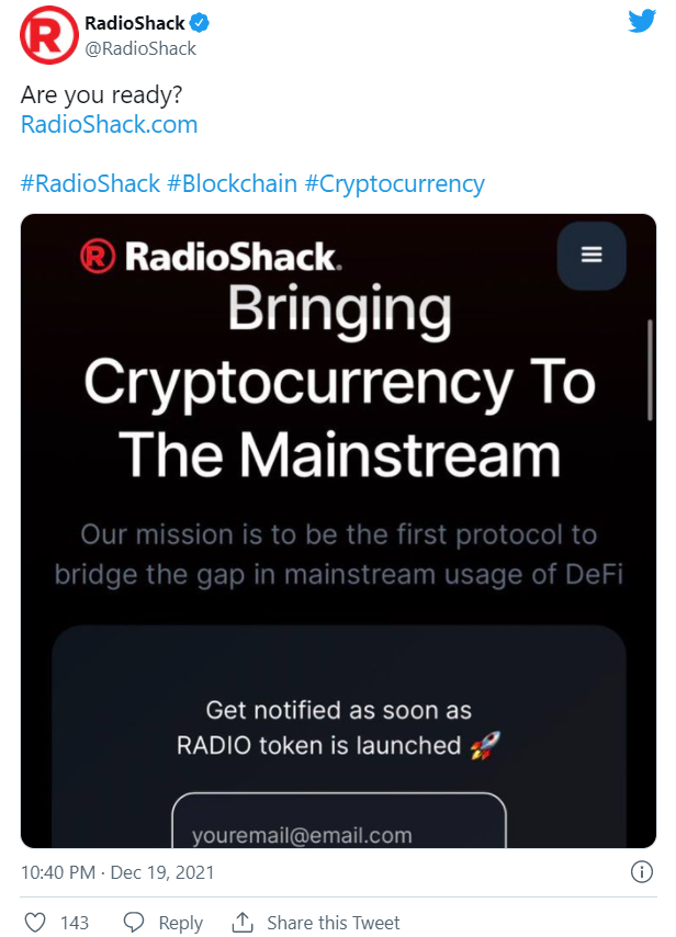 Sau khi nộp đơn xin phá sản hai lần vào năm 2015 và năm 2017, nhà bán lẻ điện tử cũ hàng thế kỷ đang có kế hoạch tung ra mã thông báo RADIO như một phần của "RadioShack DeFi" cho phép người dùng giao dịch mã thông báo thông qua giao thức Atlas USV. Atlas USV là một dự án đang cố gắng xây dựng một lớp cơ sở chung cho lĩnh vực DeFi.