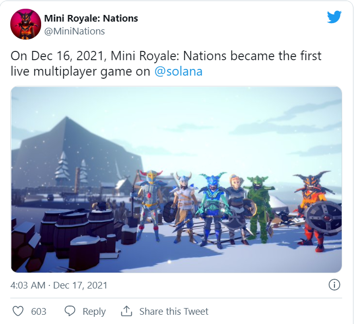 Mini Royale: Nations, một game bắn súng góc nhìn thứ nhất dựa trên web, đã trở thành trò chơi nhiều người chơi trực tiếp đầu tiên chạy trên Solana sau khi tồn tại như một trò chơi không tích hợp blockchain trong nhiều tháng. Sau khi ra mắt các vật phẩm NFT trong trò chơi đầu tiên, số lượng người chơi tích cực đã tăng gấp đôi.