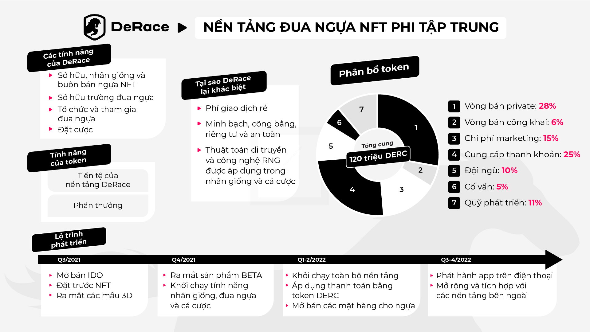 DeRace là một vũ trụ đua ngựa NFT ảo dựa trên blockchain hoàn chỉnh. Là nơi người dùng có thể tham gia vào các cuộc đua, lai tạo ngựa NFT độc đáo, tổ chức các cuộc đua trong hippodrome NFT của riêng mình và kiếm lợi nhuận từ nó.