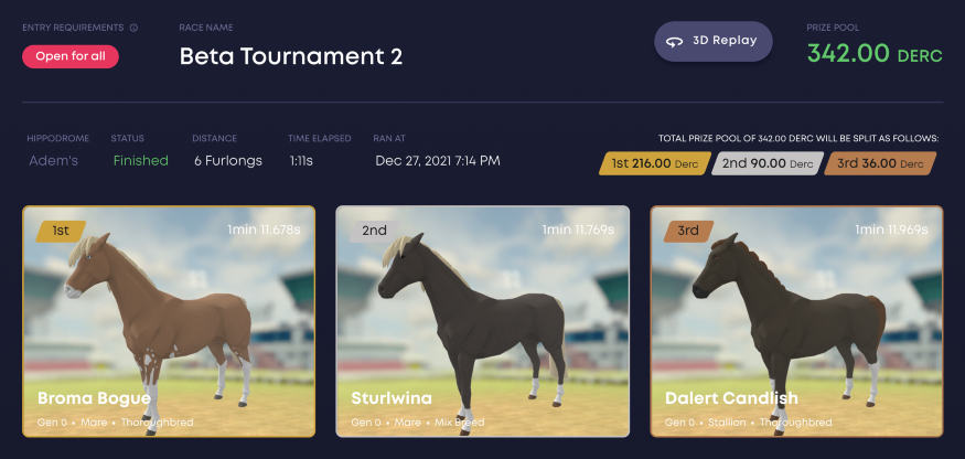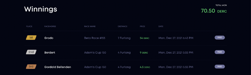 Sau khi cuộc đua diễn ra, những người chiến thắng sẽ được công bố và DERC giành được sẽ tự động phân bổ vào ví của họ. Xem tất cả tiền thắng cuộc đua trong phần “Winnings”.