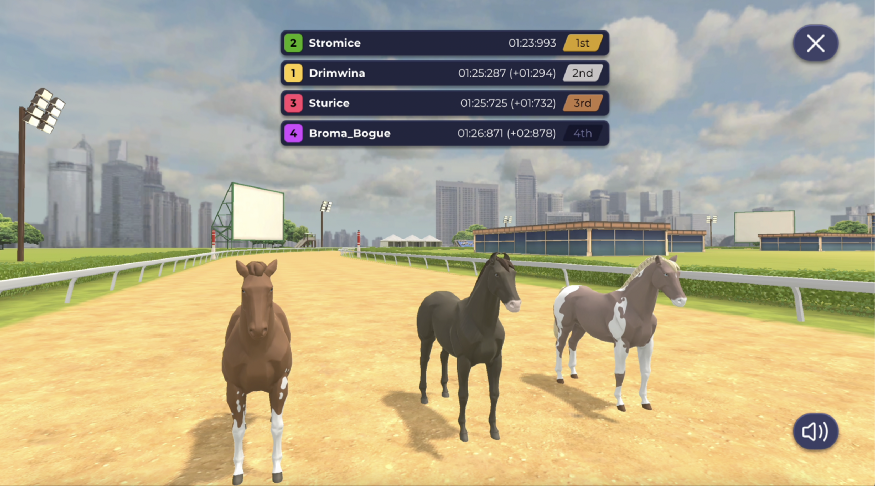 Có thể xem trực tiếp các cuộc đua hoặc xem bản ghi lại 3D. người dùng có thể tìm thấy tất cả các cuộc đua được ghi lại trong phần “Results“. (Sau khi đã thanh toán phí vào cửa và đăng ký ngựa, người dùng không thể rút lui khỏi cuộc đua. Các cuộc đua sẽ diễn ra tự động nên người dùng thậm chí không cần phải có mặt).