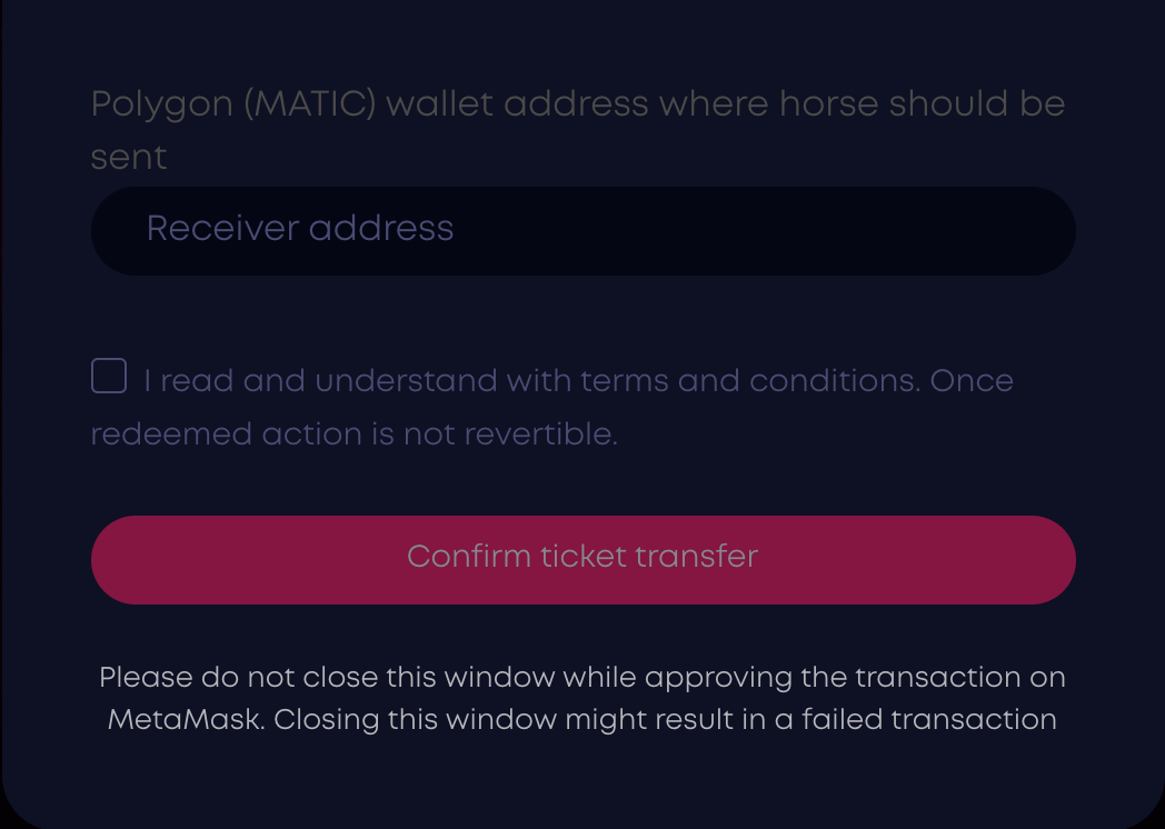 Lưu ý quan trọng: hiện tại chỉ có ví MetaMask được hỗ trợ để đổi vé ngựa NFT. Có thể mất đến 48 giờ để chú ngựa xuất hiện trong ví của người dùng, hãy kiên nhẫn!