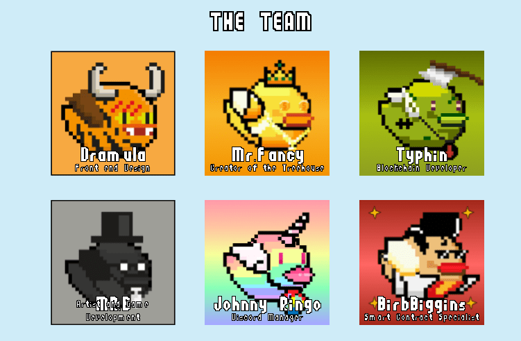 Fancy Birds team bao gồm 6 người đam mê tiền điện tử, nghệ thuật và những thách thức. Tất cả họ đều đã có trải nghiệm khác nhau bên trong không gian blockchain và mở rộng sang play-to-earn.