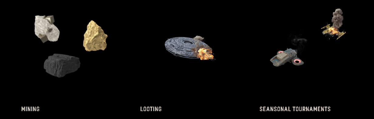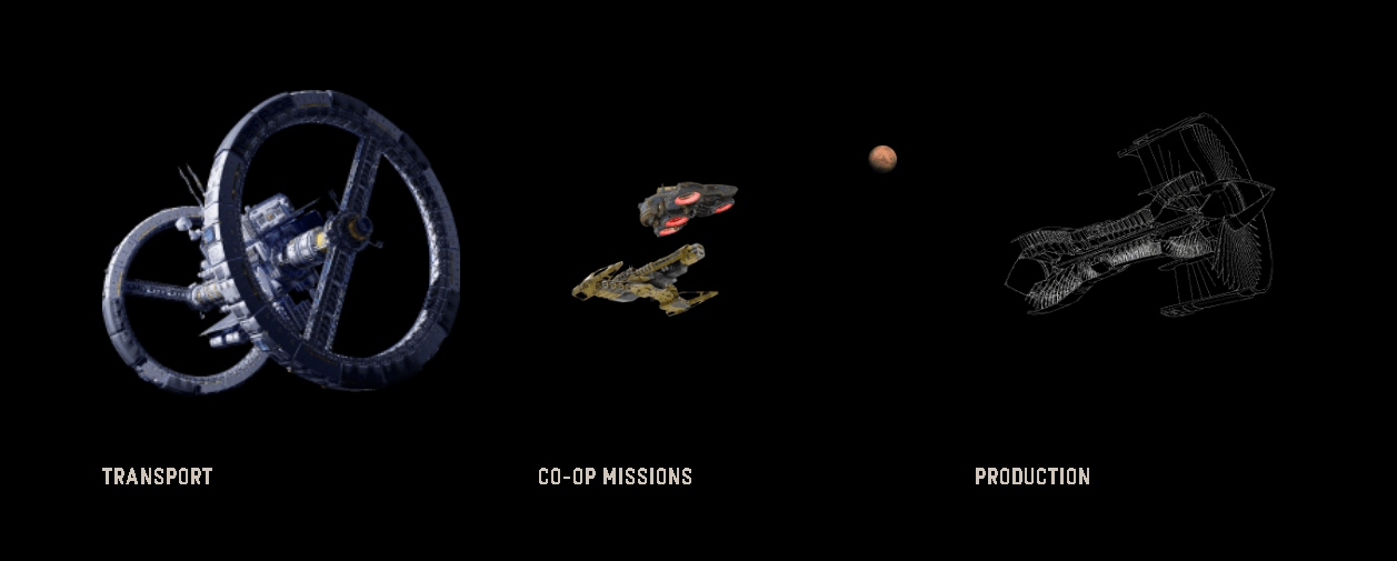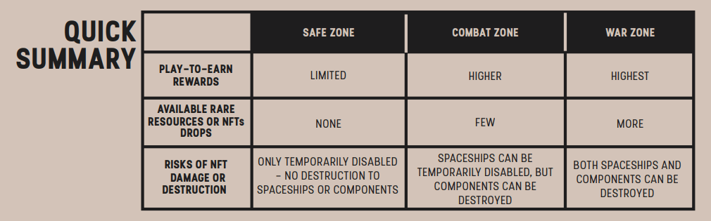 War Zone: Khu vực chiến sự nằm trong không gian sâu và ngoài tầm với của Cooperation. Tất cả các tàu vũ trụ và các thành phần khác có thể bị phá hủy trong chiến đấu, tùy thuộc vào mức độ nghiêm trọng của thiệt hại. Những tàu vũ trụ bị phá hủy có thể bị cướp bởi những người chơi khác (nhưng luôn ở mức giảm giá trị thị trường của tàu vũ trụ để duy trì mã số mã hóa cân bằng và giảm phát). Do đó, người chơi nên đi cùng với đồng đội của mình nếu họ vào vùng chiến sự (hoặc trong tình trạng tàng hình nếu họ muốn tránh xung đột). Phần thưởng play-to-earn trong War Zone là phần thưởng cao nhất trong số 3 khu vực và có các loại tài nguyên hiếm nhất mà người chơi không thể tìm thấy ở 2 khu vực còn lại.