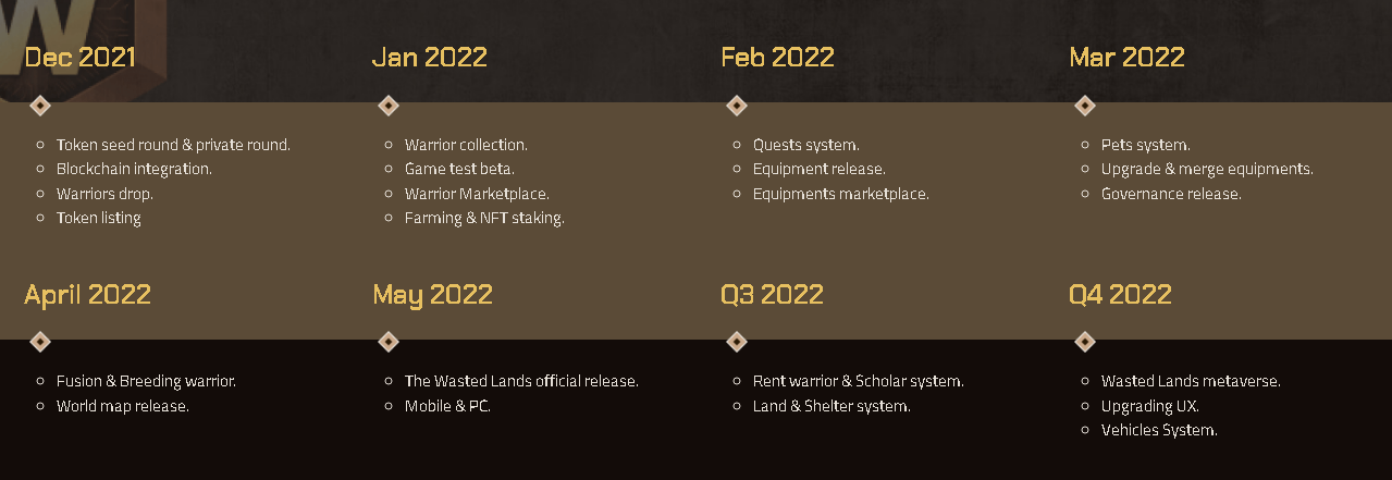 The Wasted Lands được hình thành ý tưởng trong bối cảnh đại dịch đã làm thay đổi toàn bộ cuộc sống của chúng ta. The Wasted Lands sẽ ra mắt thị trường vào cuối năm nay, nơi người chơi có thể mua NFT chiến binh, vật nuôi và thiết bị. Sắp tới, bạn có thể hợp nhất và lai tạo các chiến binh để phát triển hoặc tăng cường quân đội của mình. Điều này cũng sẽ cho phép tùy chỉnh và cá nhân hóa nhiều hơn. The Wasted Lands ra mắt cả trên điện thoại di động (iOS & Android) phiên bản PC nên cộng đồng có thể dễ dàng tiếp cận hơn. Trong bối cảnh sự phát triển mạnh mẽ của ngành công nghệ blockchain nói chung và gamefi nói riêng thì The Wasted Lands nhất định sẽ có nhiều cơ hội phát triển hơn nữa.