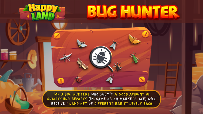 Đây là sự kiện dành cho những thành viên tham gia trải nghiệm phiên bản testnet của Happy Land. 3  thành viên phát hiện ra nhiều lỗi nhất trong phiên bản Testnet lần này sẽ nhận được  1 NFT Land với các cấp độ hiếm khác nhau.